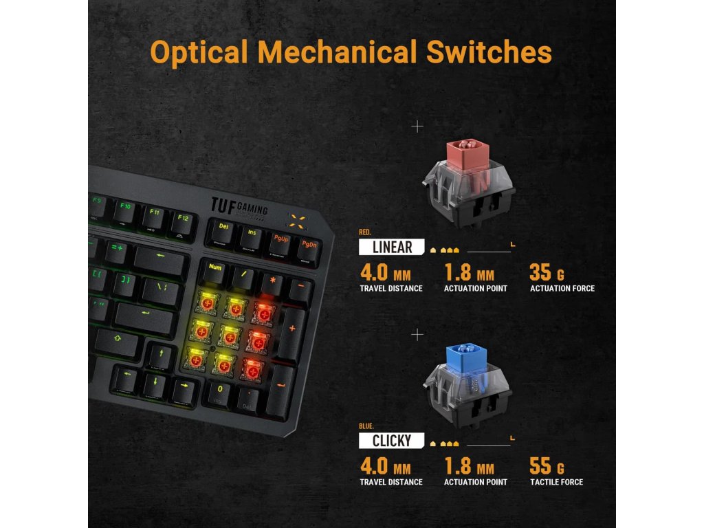 ✅ TUF Red mechanické spínače – hladká odezva, dlouhá životnost a minimální síla ke stisku