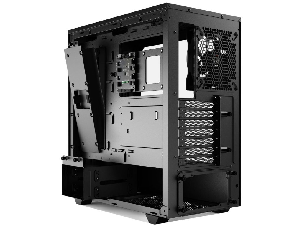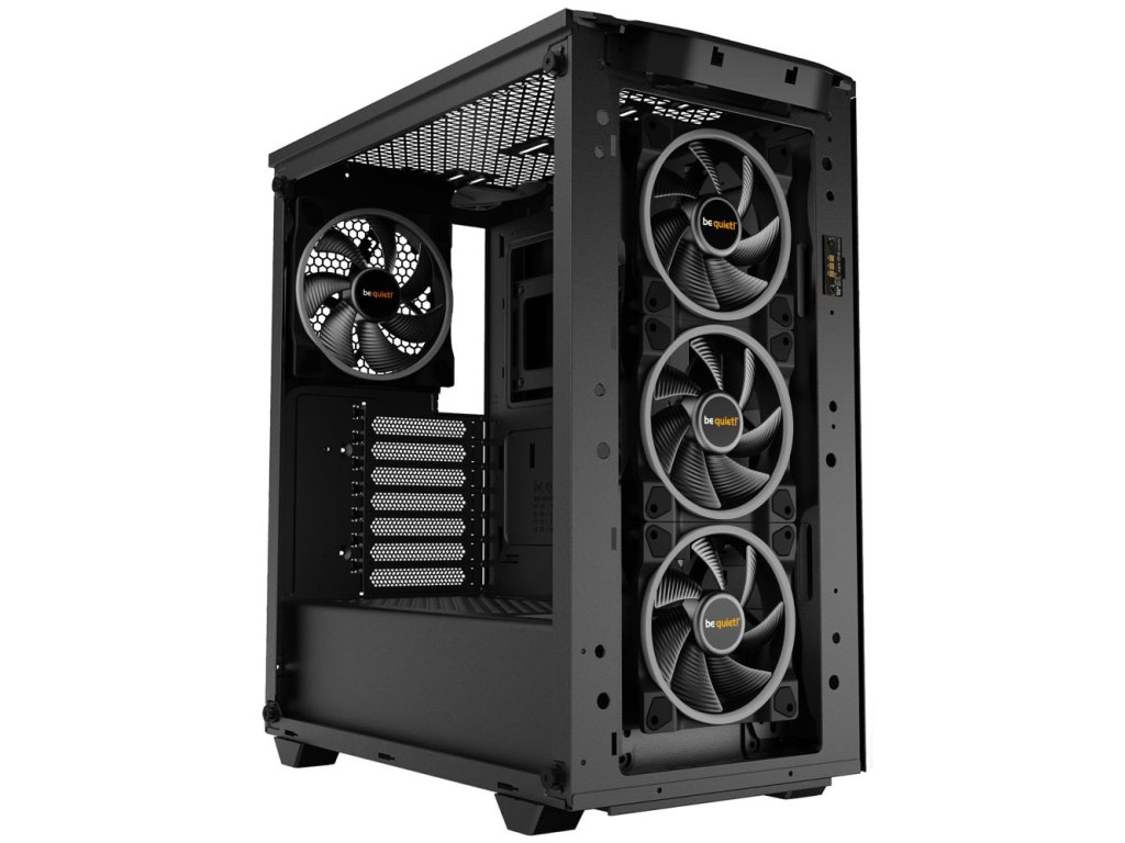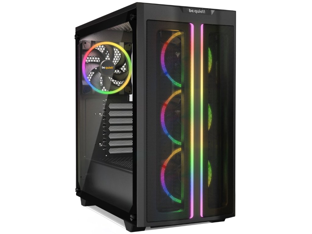 Be quiet! PURE BASE 500FXSkříň s průhlednou bočnicí a ARGB LED osvětlením nabízí dvě 3,5" pozice pro pevné disky a čtyři 2,5" pozice pro SSD disky. Na horním panelu naleznete jeden port USB 3.0, jeden port USB-C a dále také konektor pro sluchátka a konektor pro mikrofon. Skříň je osazena třemi ventilátory o velikosti 120 mm na přední straně a jedním ventilátorem o velikosti 140 mm na zadní straně. Důmyslné řešení umožňuje pohodlné umístění až 360 mm dlouhého výměníku vodního chlazení na přední straně. Ve skříni je dostatek prostoru pro chladič CPU do výšky až 190 mm a grafickou kartu o délce až 369 mm. Skříň je dodávána bez zdroje.