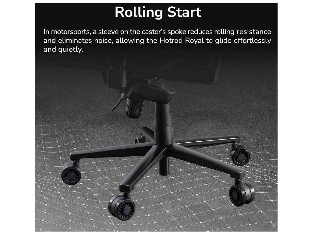 Povrch/Pláště koleček snižují tento odpor a zároveň eliminují hluk, což umožňuje Hotrod Royal klouzat po jakémkoli povrchu bez námahy a velmi tiše.