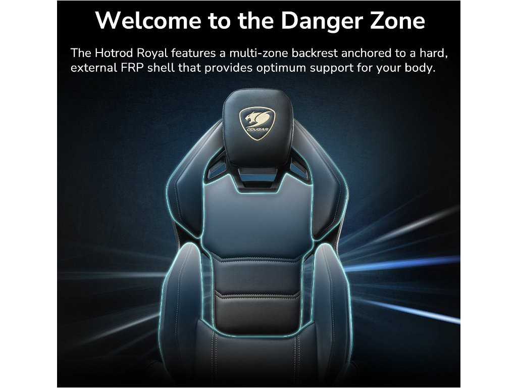 Design herního křesla Hotrod Royal obepíná tělo a obsahuje vícezónové opěradlo ukotvené k tvrdé vnější FRP skořepině,